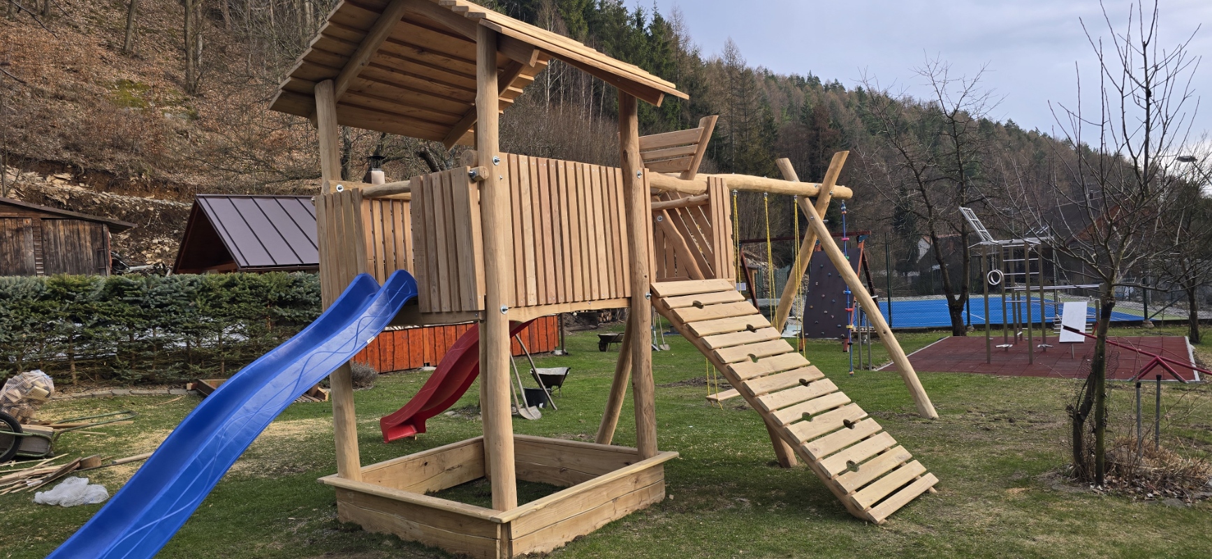 ANO, k dispozici jsou dvě sítě ( nohejbal nebo volejbal a tenis), 2 x opory sítě, 2 x branky rozměr florbal. Pin pingový stůl. Jsou tam nějaké pálky na pin pong a míčky, stav spíše horší. Balóny vzhledem k zacházení jsou také v horším stavu, hlavně díky neuklízení do boudy a ponechání na zahradě za jakéhokoliv počasí. Doporučení: rakety, míčky, pálky, balony atd. si berte své.