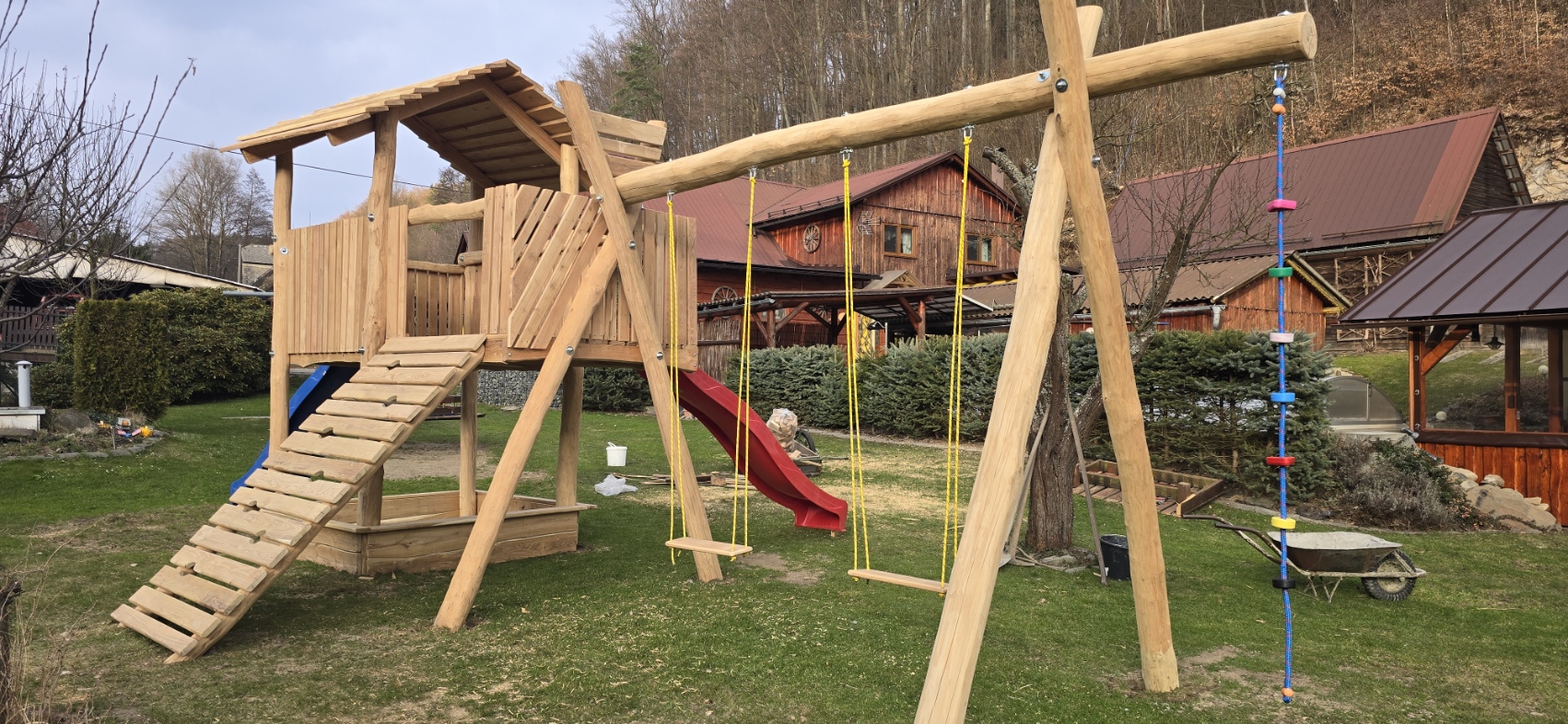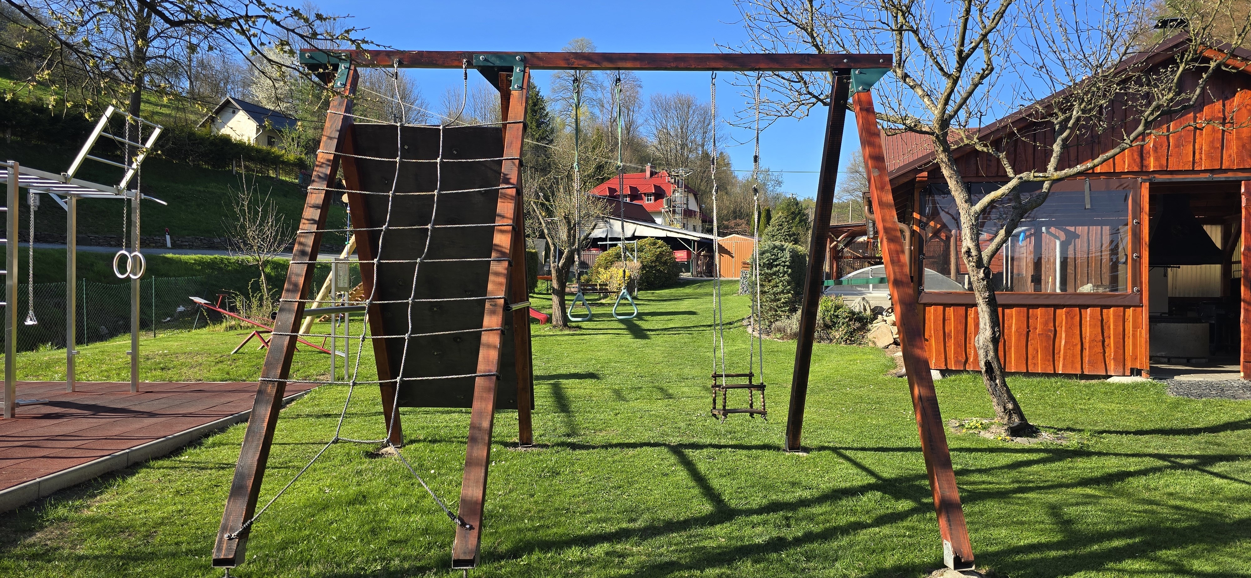 NE, zahrada je z větší části oplocená. Tam kde není plot je prudký svah do kopce – lesa. Stavění dětských přístřešků, bazénků nebo stínidel – je třeba tyto pravidelně posouvat, aby nedocházelo k vypalování trávníku pod nimi. V létě min. 1x denně. Stavění stanů není dovoleno.